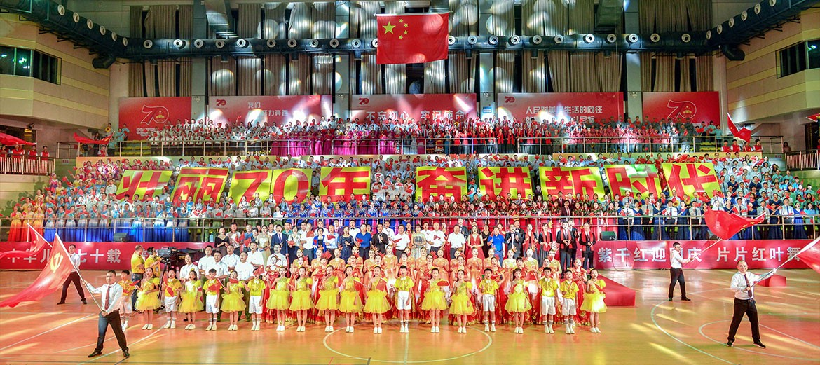 會(huì)場(chǎng)選在廉江體育館舉辦,廉江電視臺(tái)現(xiàn)場(chǎng)直播與市民一起同慶共樂(lè),我司將會(huì)場(chǎng)設(shè)計(jì)了一系列建國(guó)70周年和新中國(guó)發(fā)展壯大的展板和標(biāo)語(yǔ)來(lái)營(yíng)造國(guó)慶氣氛,參與表演的演員人手一朵太陽(yáng)花象征新中國(guó)發(fā)展正值朝陽(yáng)之時(shí),還做了兩面10x5米紅旗和一面11x5米的黨旗,為“立國(guó)篇”開(kāi)場(chǎng)展示黨和國(guó)家的強(qiáng)大。